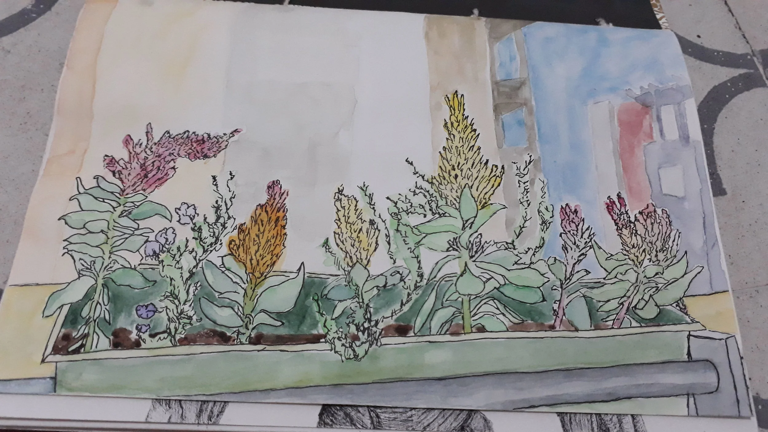 watercolor, pen, and ink on Canson 1557 cream-colored drawing paper